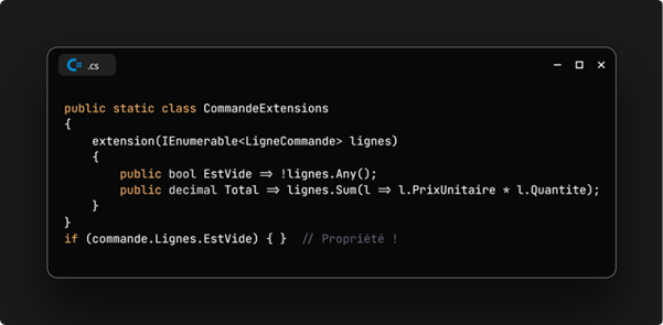 C#14 règle ça. On peut maintenant créer des propriétés d'extension, des méthodes statiques d'extension, et même des opérateur.